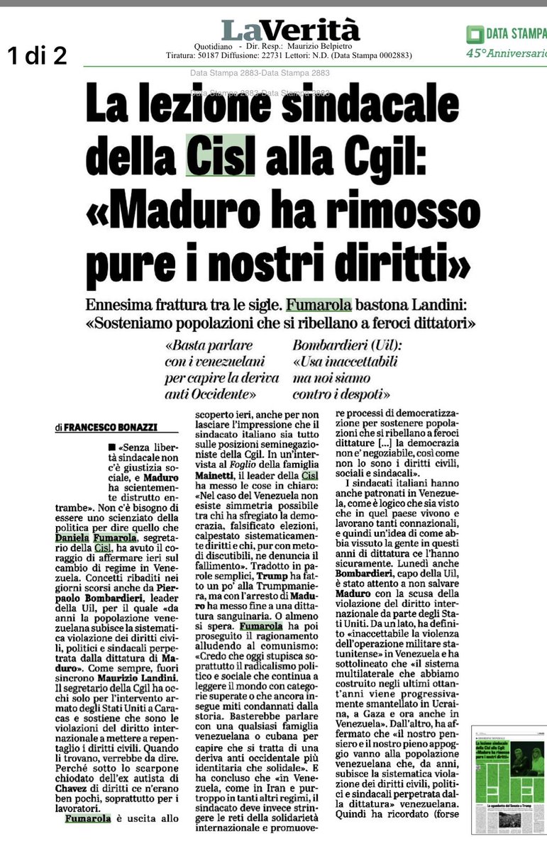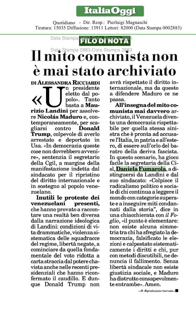 Posizione limpida e senza equivoci della Cisl sul regime di Maduro in Venezuela.
