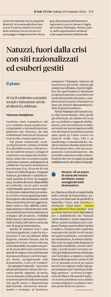 — Luigi Sideri, Filca Cisl Bari, su Il Sole 24 Ore del 10